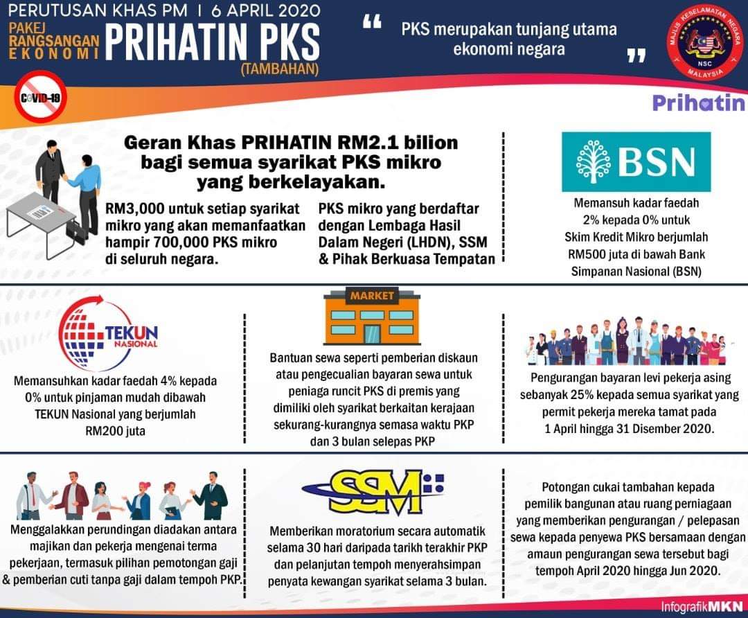 06042020 Geran Khas PRIHATIN berjumlah RM21 bilion bagi semua syarikat PKS mikro yang berkelayakan. Di bawah Pakej Bantuan Perlindungan Ekonomi dan Rakyat Malaysia PERMAI Kerajaan telah mengumumkan bantuan kewangan secara one-off sebanyak RM1000 melalui Geran Khas Prihatin GKP Tambahan kepada PKS mikro di 12 negeri Perintah Kawalan Pergerakan PKP yang berkuatkuasa pada bulan. 11042020 BSN Micro i Kredit Prihatin adalah skim pembiayaan pinjaman mikro yang ditawarkan kepada perusahaan mikro yang mana perniagaan yang mereka jalankan terjejas akibat wabak COVID-19.